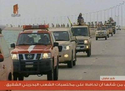 | A pedido del rey Hamad ibn Isa Al-Khalifa y con el apoyo de Estados Unidos, las tropas de Arabia Saudita penetran en Bahrein el 14 de marzo de 2011 para aplastar la revuelta. |